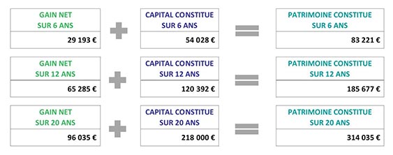 Sur le long terme, M. et Mme BONNINVEST vont se constituer un patrimoine grâce à 2 leviers : le bénéfice que génère la location (gain net) et l’épargne réalisée via le remboursement du prêt à la banque pour payer le bien (capital constitué).