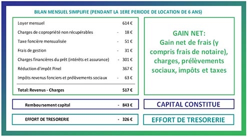 Avec cet investissement, M. et Mme BONNINVEST auront des revenus fonciers (ils percevront un loyer hors charges de 614€ / mois), rembourseront un crédit (1144€/mois assurance incluse) et paieront les charges incombant au propriétaire (taxe foncière, certaines charges de copropriété, frais de gestion). Les intérêts d’emprunt, l’assurance et les diverses charges sont déductibles des revenus fonciers. Grâce à la réduction d’impôts Pinel, ils effacent totalement leurs impôts sur les revenus du travail.